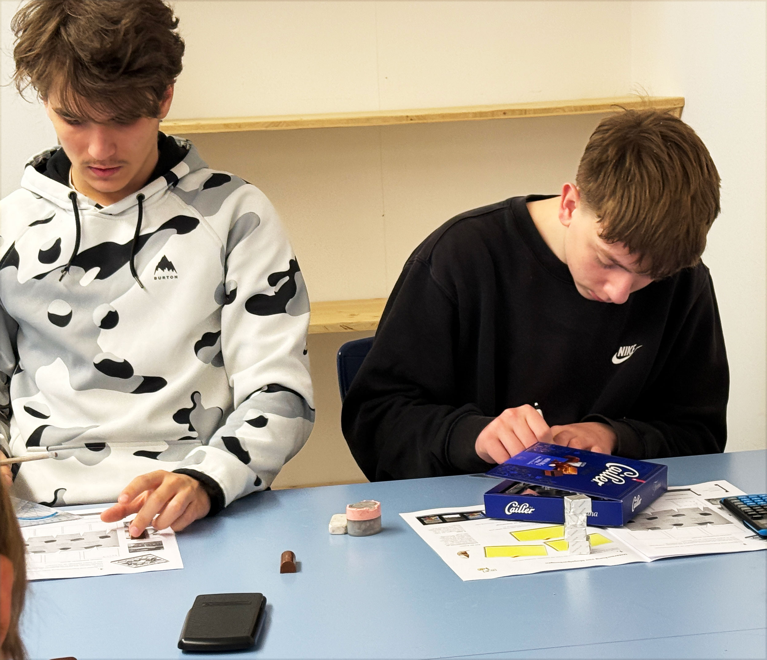 Die Lernenden des Mathe-Fachateliers Niveau 1 untersuchen in Teams, wie viel Schokolade tatsächlich in einer Verpackung steckt. Dazu messen sie die Schachtel, bestimmen die Formen der Pralinen – zum Beispiel Quader oder halbe Zylinder – und berechnen deren Volumen.