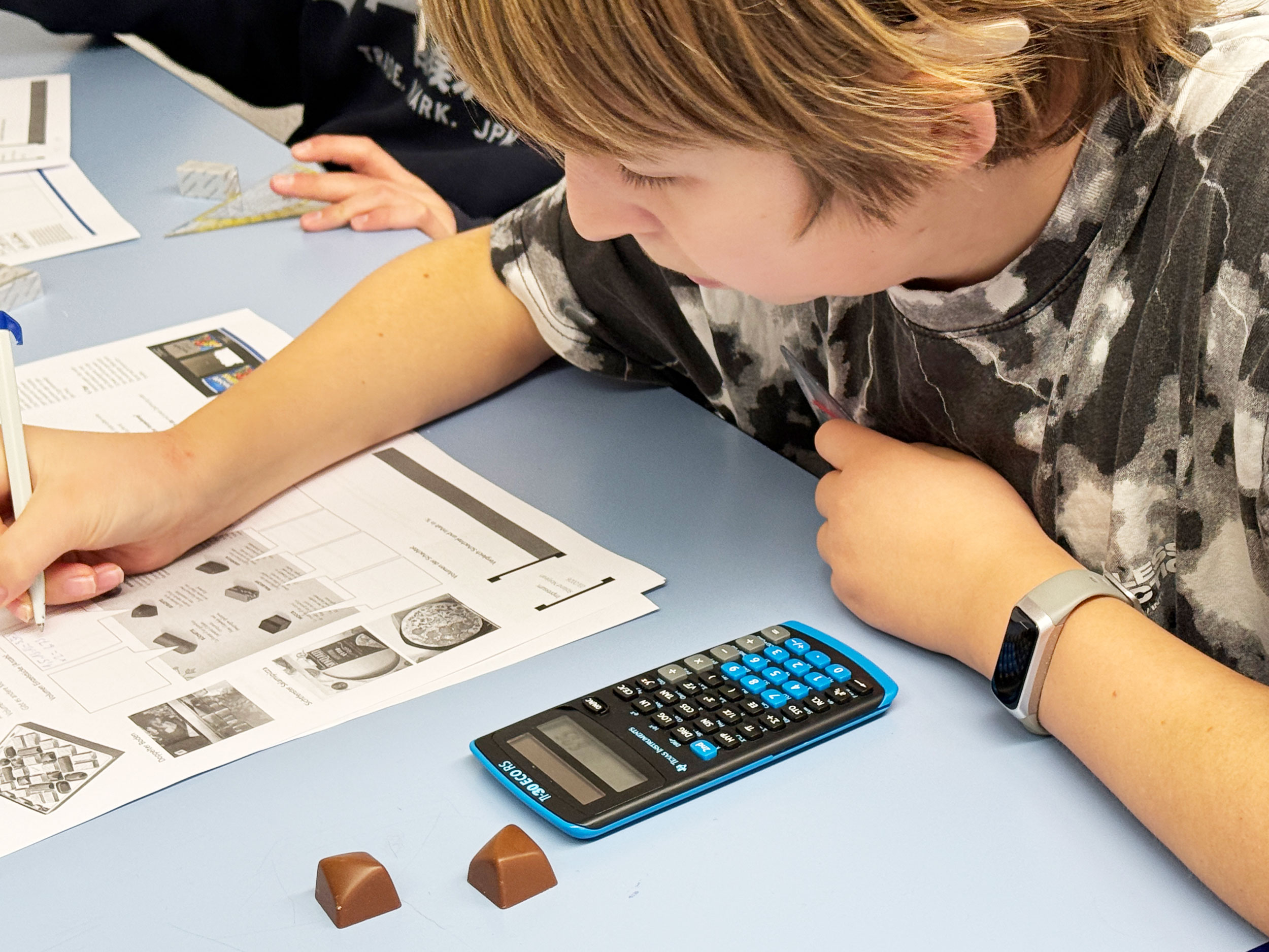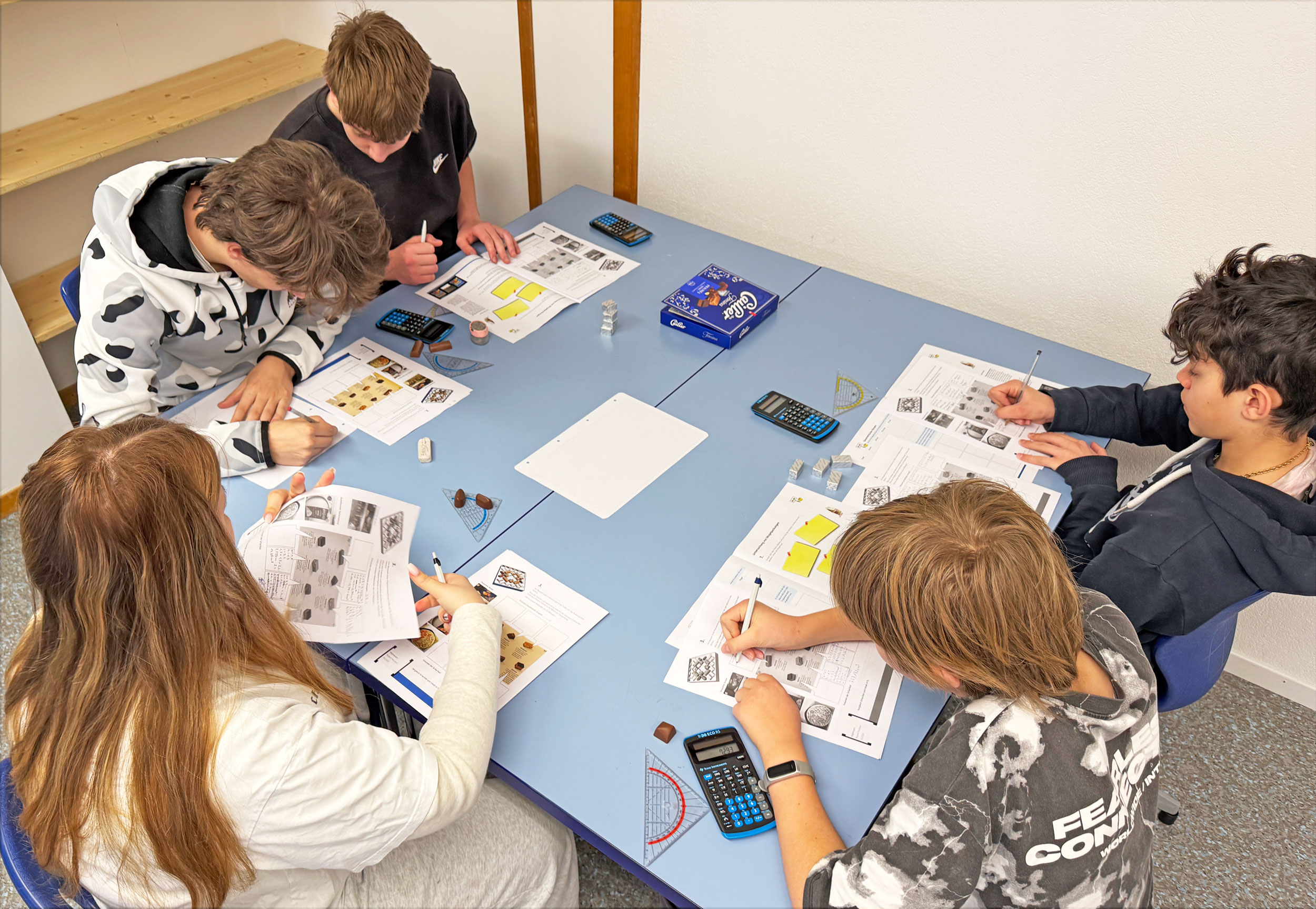 Die Lernenden des Mathe-Fachateliers Niveau 1 untersuchen in Teams, wie viel Schokolade tatsächlich in einer Verpackung steckt. Dazu messen sie die Schachtel, bestimmen die Formen der Pralinen – zum Beispiel Quader oder halbe Zylinder – und berechnen deren Volumen.
